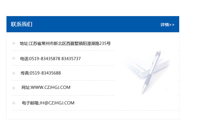 地址:常州市新北區友邦商務大廈1幢16、17層  電話:0519-85101652  傳真:0519-85112595  郵編:213022  網址:www_cz-jiayue_cn.hndqcm.com  郵箱:xiajifengaa@163.com
